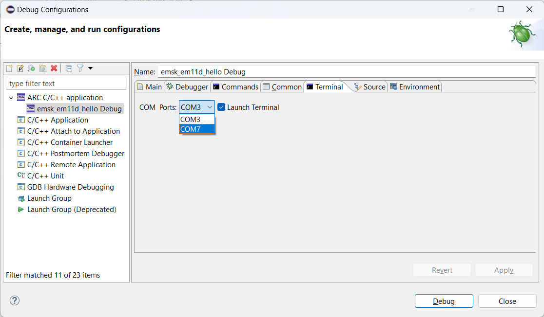 Navigate to Terminal inner tab of Main tab and select a COM port for