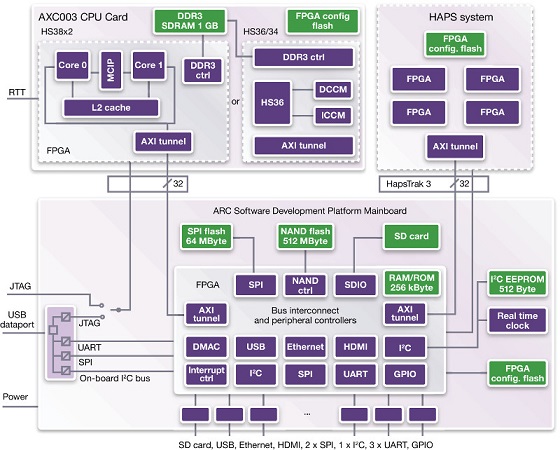 The ARC AXS103 Software Development Platform includes the AXC003 CPU Card and supports the ARC HS34, HS36 and HS38 processors. It allows processor operation at the following speeds: